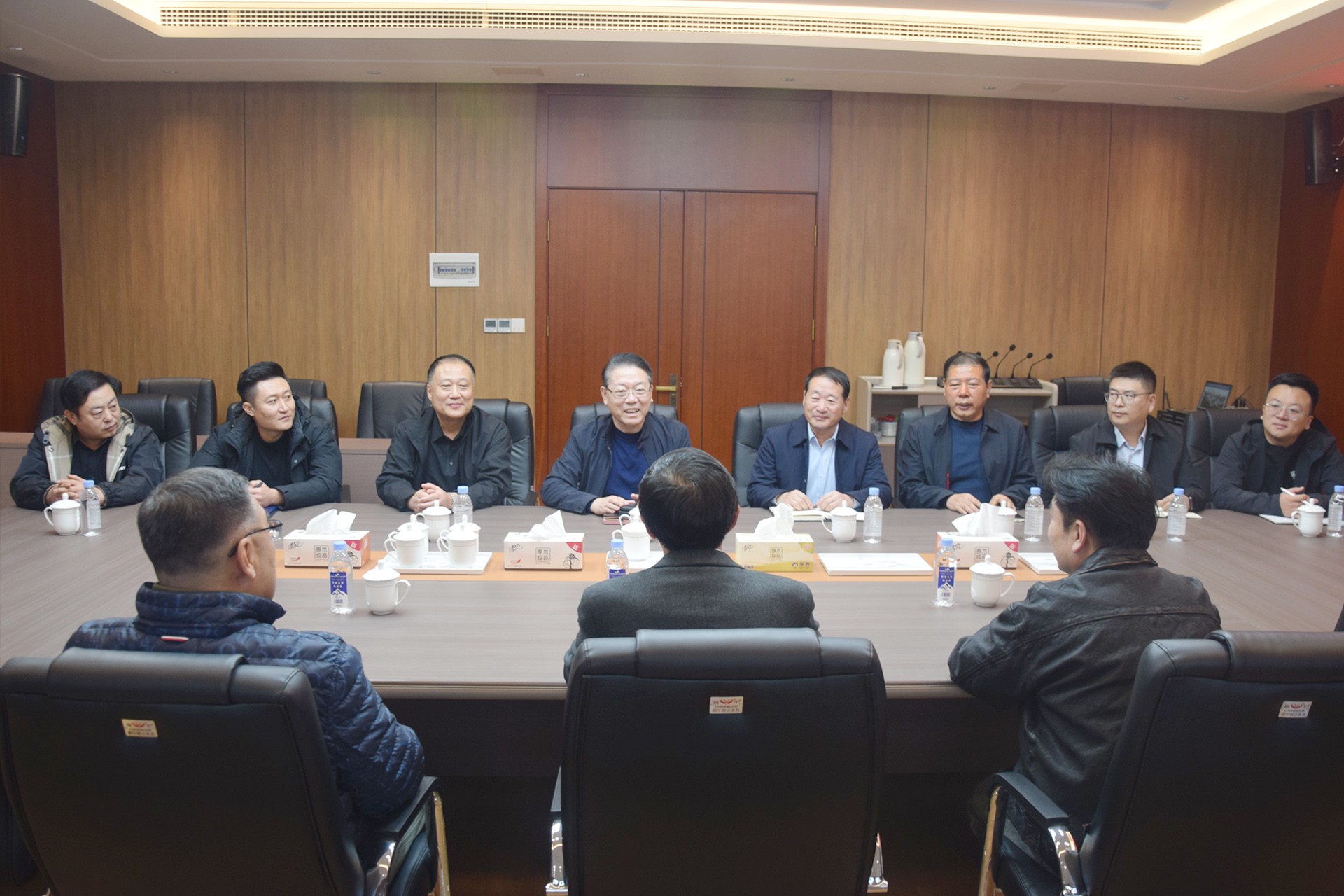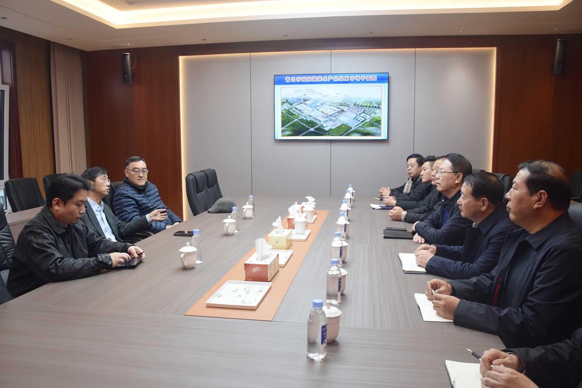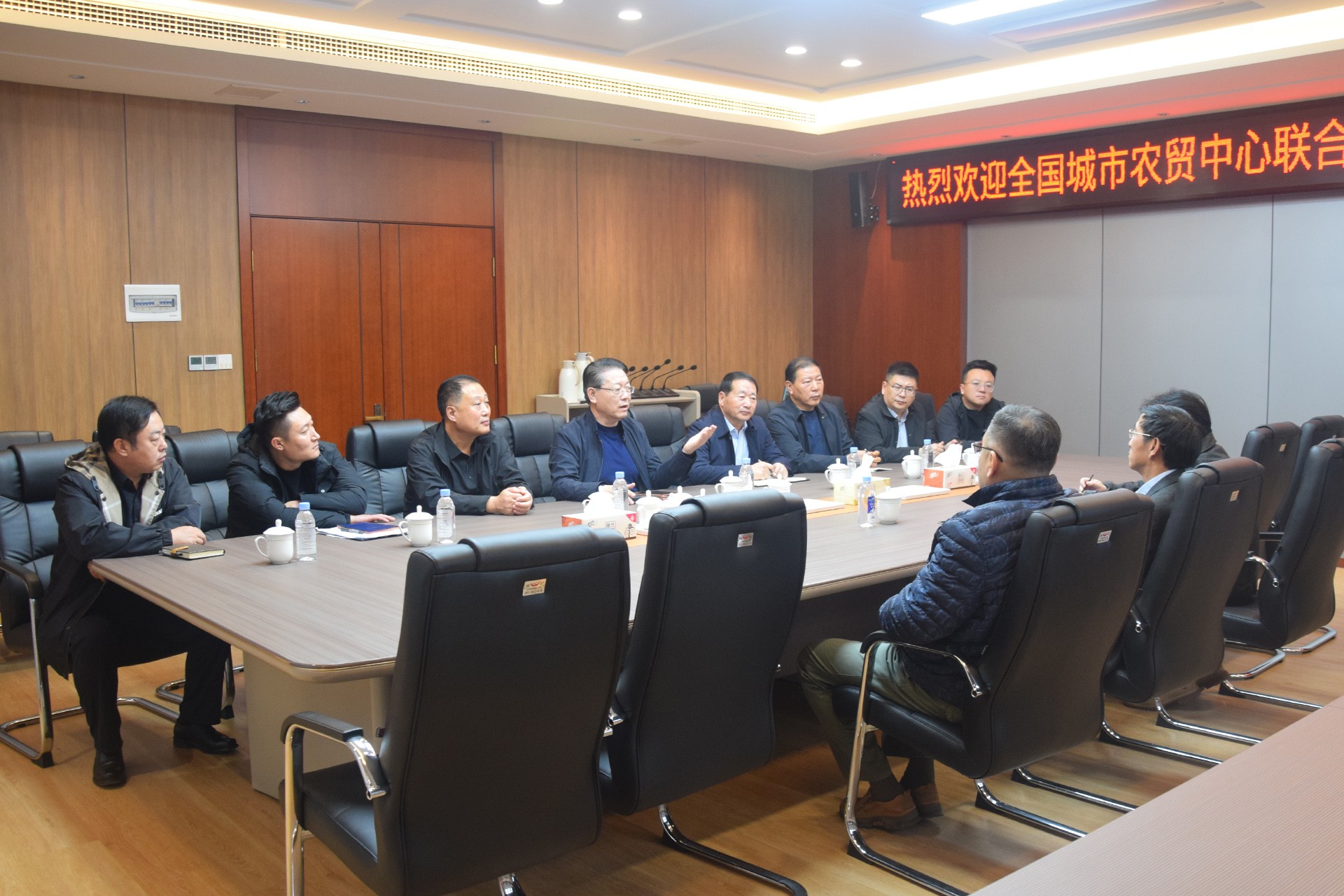 在社区三楼中心会议室,城阳批发市场董事长、总经理袁波友对马会长一行到来表示热烈欢迎,衷心感谢全国城市农贸中心联合会一直以来对城阳批发市场建设发展的关心和大力支持,并就市场发展现状与未来规划进行了介绍。马会长对城阳批发市场在探索创新发展模式、保障民生供应、服务区域经济发展等方面经验做法给予高度评价。马会长指出,在新发展形势下,批发市场要全面提升商品集散、信息互通、质量监管等基础功能,重点加强供应链体系建设,深化与农产品核心产区战略合作,建立稳定直采渠道,持续提升市场核心竞争力。双方还围绕批发市场行业发展趋势研判、支持政策解析以及推动高质量发展等方面进行了深入交流。