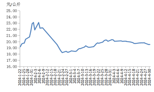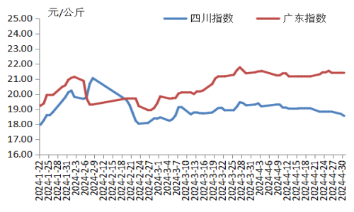 本周华东地区猪肉价格环比小幅下跌,周内先下跌后企稳。因上周规模养殖场的生猪出栏量加大,带动生猪及猪肉供应增加,周初价格下跌。周内规模养殖场和散养户积极出栏,生猪供应增加;同时逢“五一”备货,猪肉订单量增加,供需双增支撑猪肉价格稳定运行。